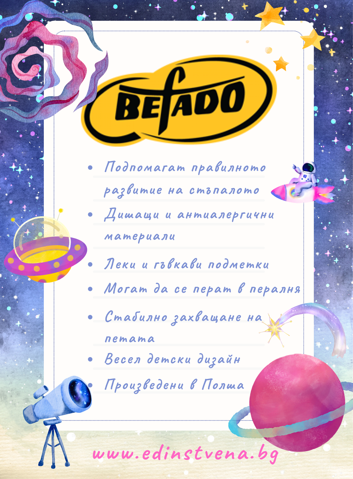 Befado е марка, създадена с разбиране към нуждите както на децата, така и на техните родители. Всеки детайл е измислен така, че обувките да издържат на безкрайните детски игри, скачане и тичане. Цветните десени, животинските мотиви и веселите апликации превръщат обуването в забавно преживяване, а не в битка.