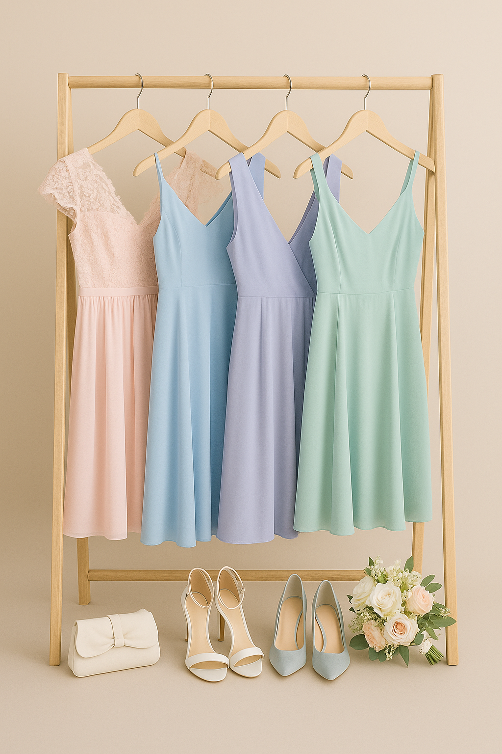 Different cuts, same color – all bridesmaids wear dresses in the same palette but with different lengths and models suited to their body type.