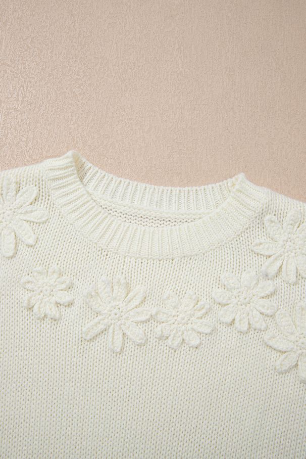 - Soft and cozy white sweater with knitted 3D floral details across the chest.