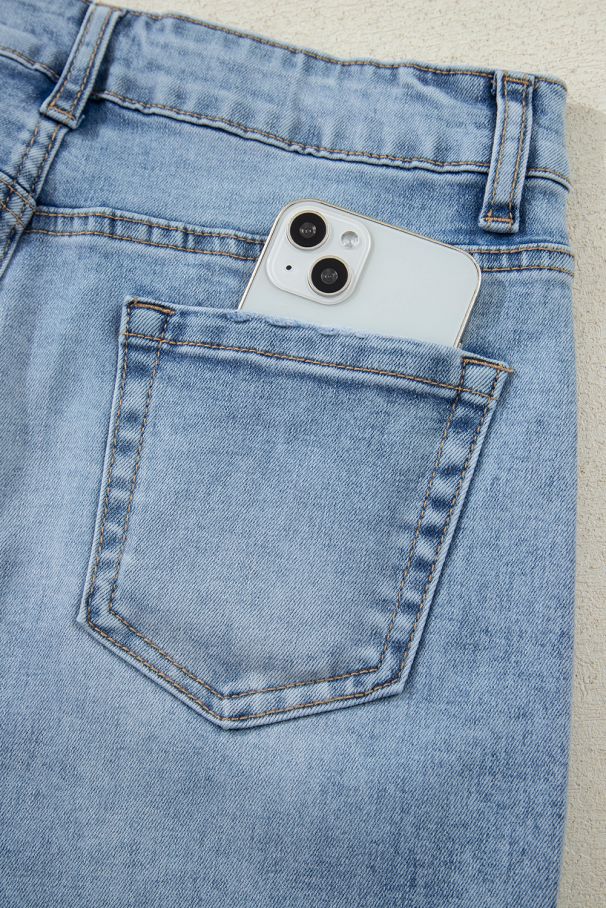 - Women’s blue jeans with high waist and drawstring tie.