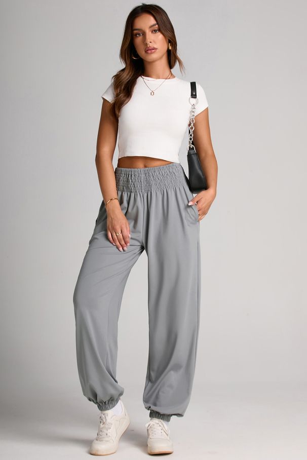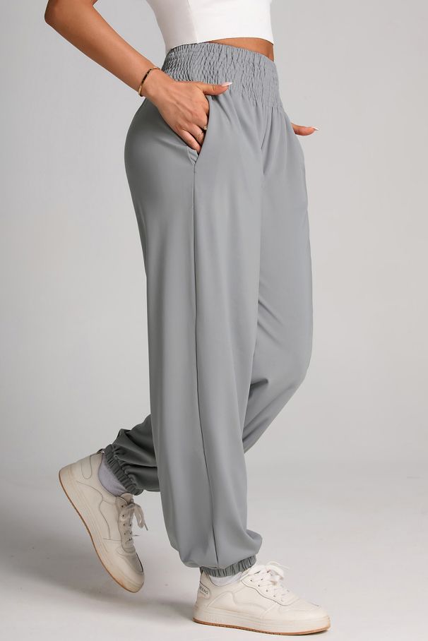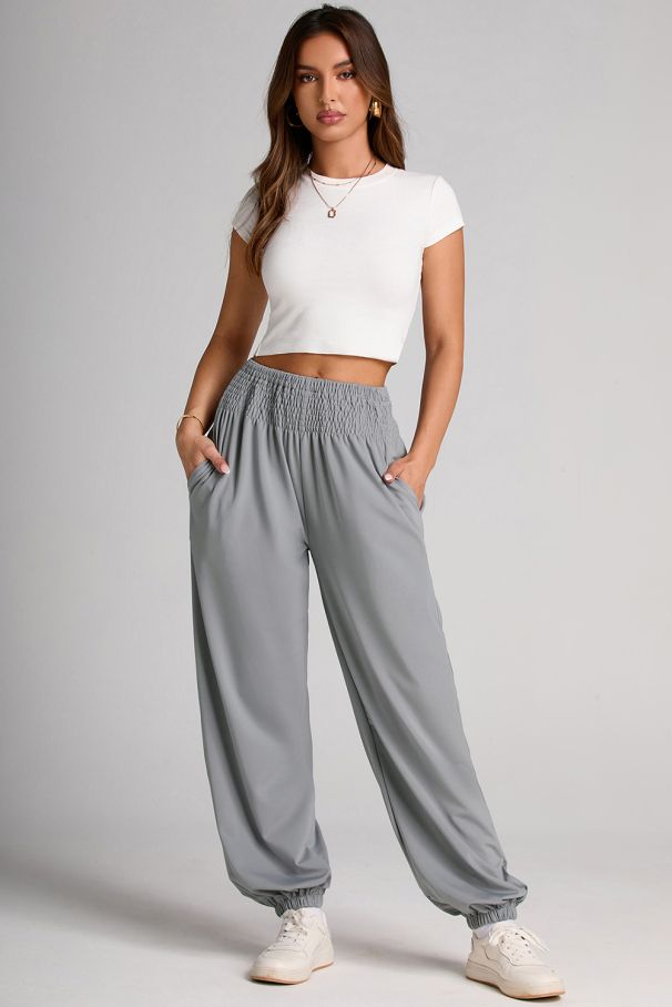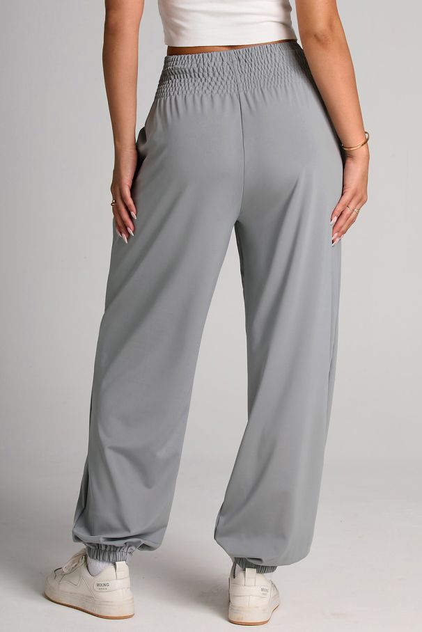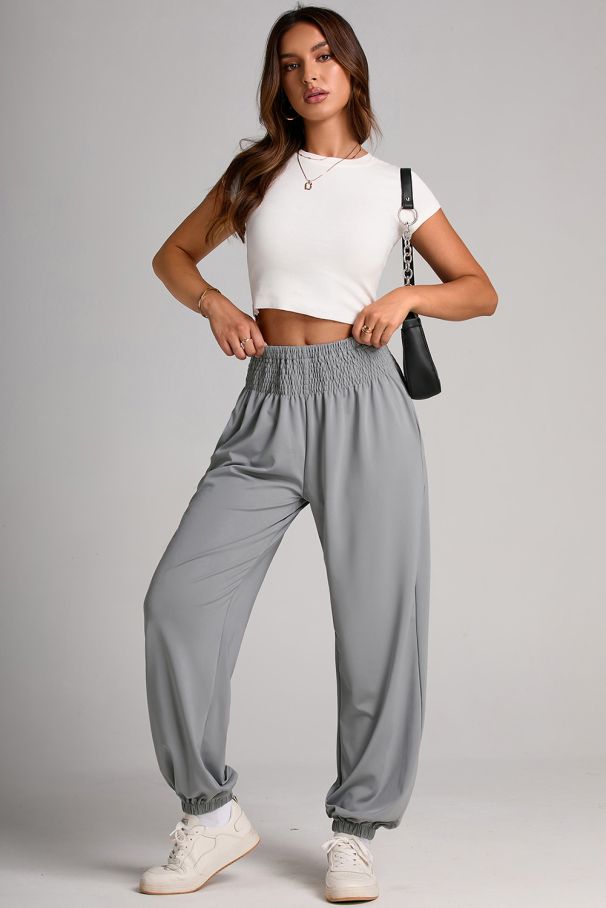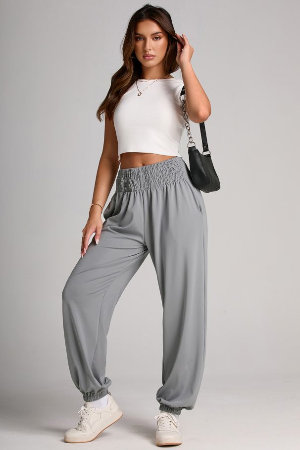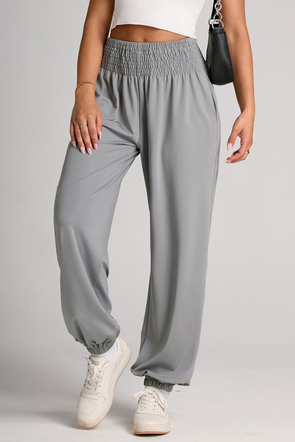 - Featuring a high smocked waist and elastic cuffs for a flattering fit.
