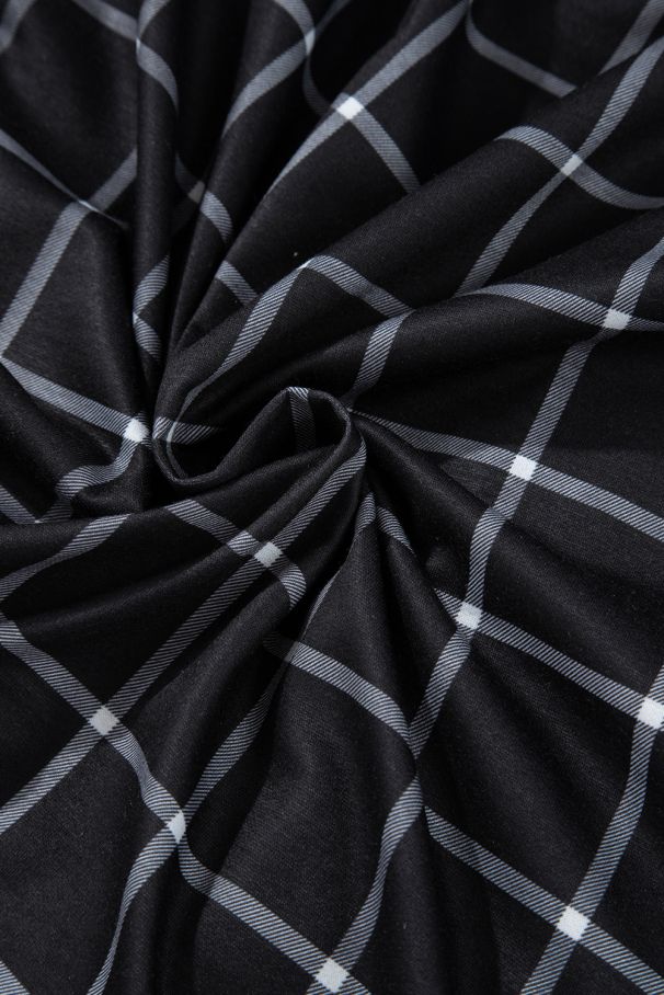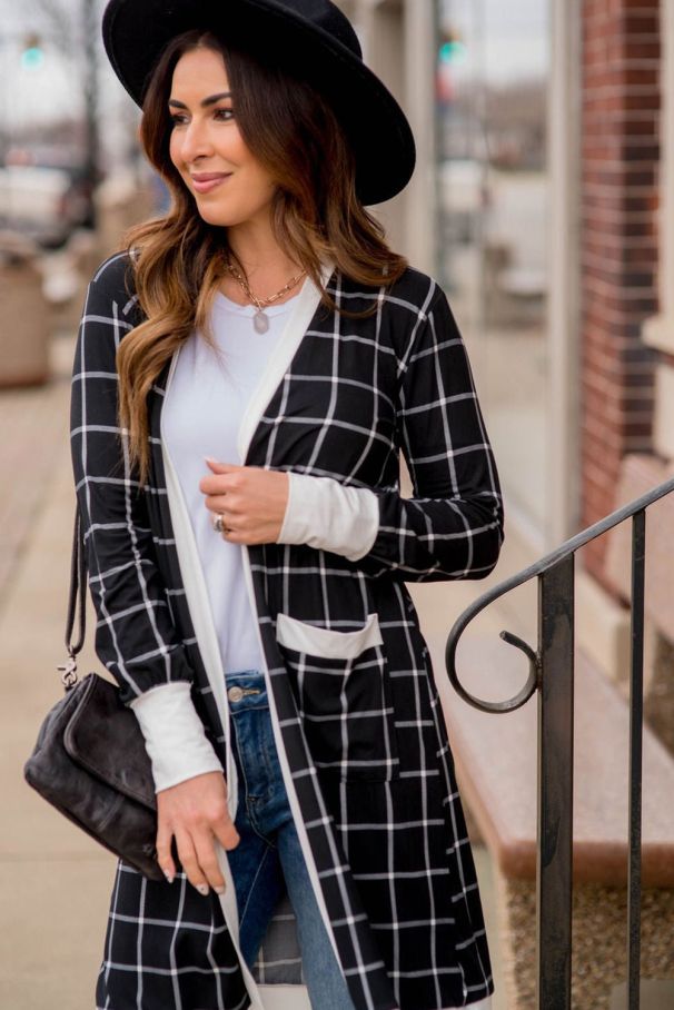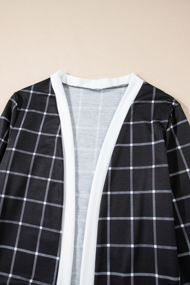 - Stylish and comfortable black cardigan with a white plaid pattern.