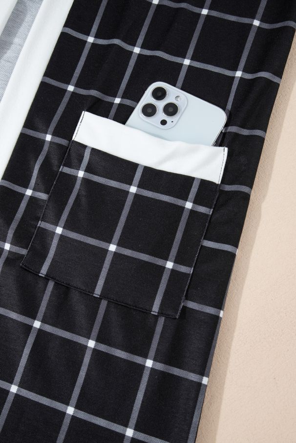 Women’s Black Plaid Colorblock Cardigan with Pockets
