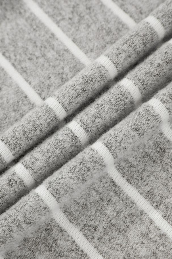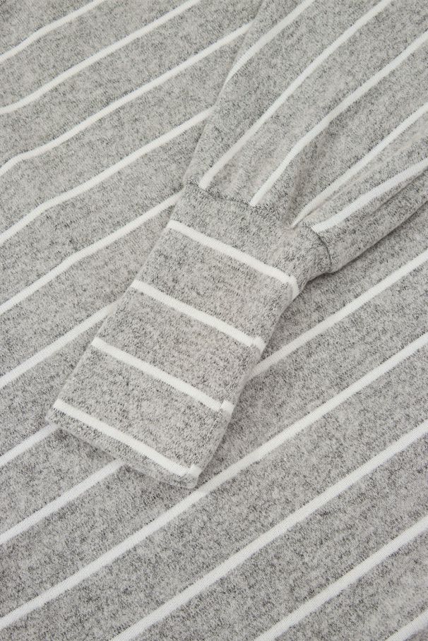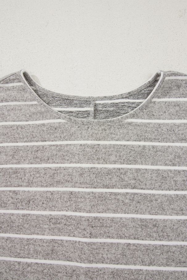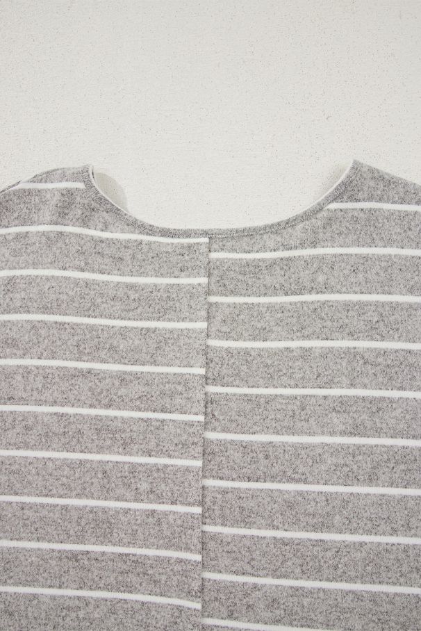 • A soft gray blouse with delicate horizontal stripes and a relaxed fit.