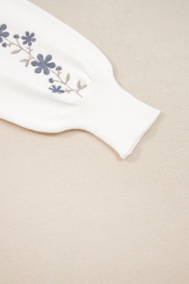 - Soft and feminine short white sweater featuring delicate floral embroidery in blue.