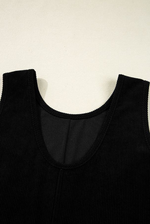 - Chic and versatile, this black corduroy mini dress features a soft texture, sleeveless design, and practical front pockets.