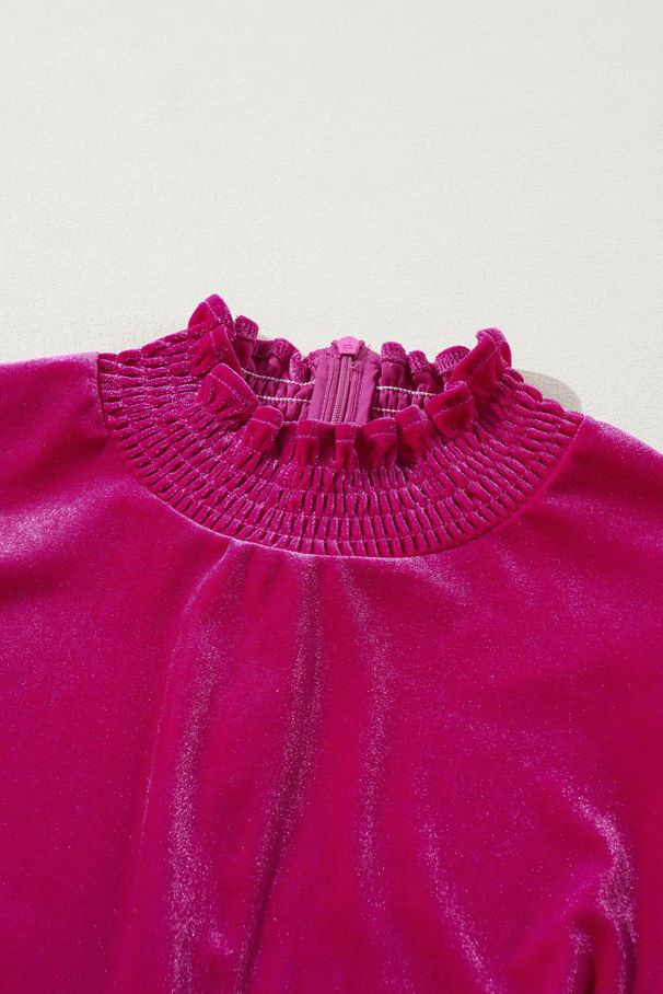 - This luxurious velvet mini dress in a deep magenta tone combines classic elegance with a modern twist.