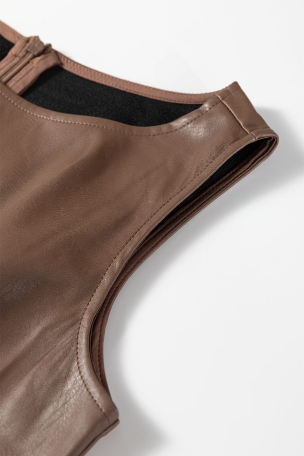 - The sleeveless cut and sleek silhouette create a confident, feminine look, while the soft faux leather feels luxurious and comfortable.