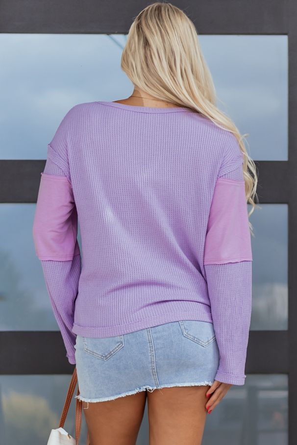 - Soft and stylish, this lavender top features mixed textured panels, a relaxed fit, and a front pocket for a casual yet trendy look.