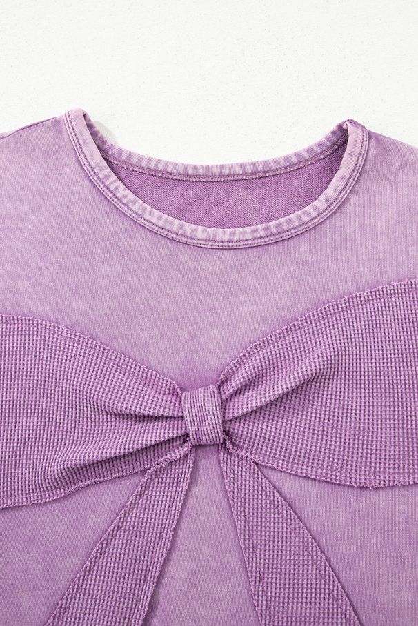• Charming and stylish, this lavender top stands out with its oversized bow detail on the front.