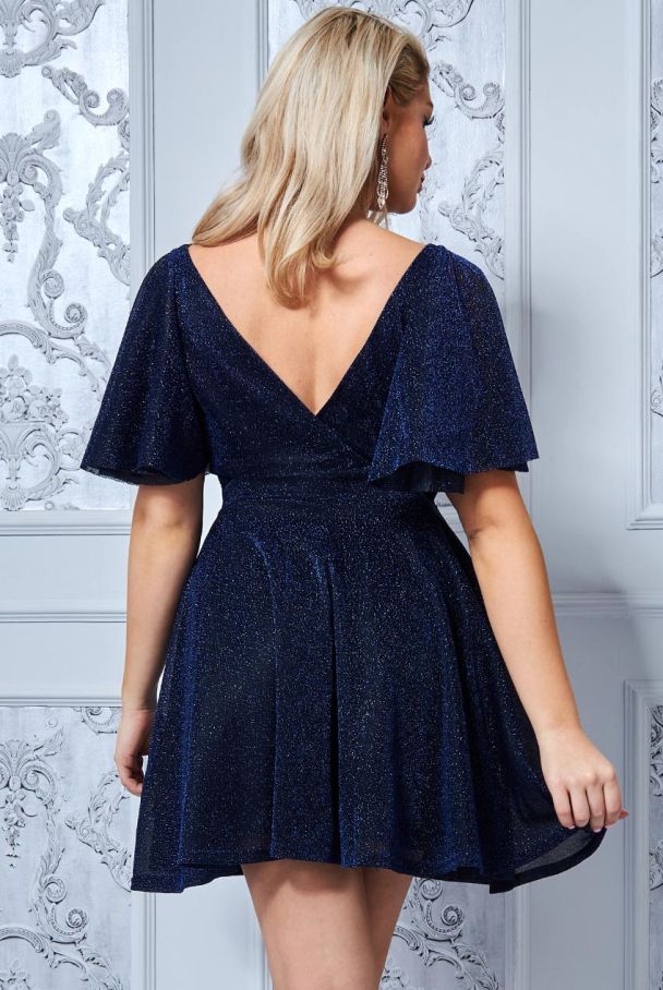 Home Clothing Women's Navy Glitter Short Dress with Flared Skirt and Flutter Sleeves