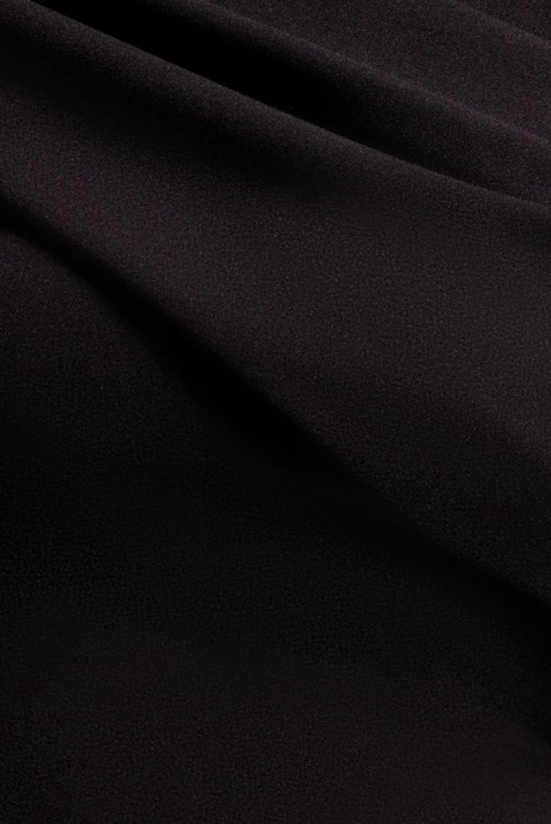 • A timeless long black gown with an asymmetric off-shoulder neckline and soft draping that enhances the feminine silhouette.