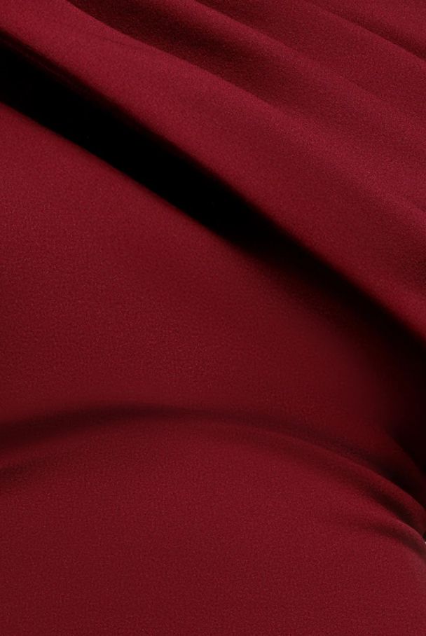 - A timeless long burgundy gown with an asymmetric off-shoulder neckline and soft draping that enhances the feminine silhouette.