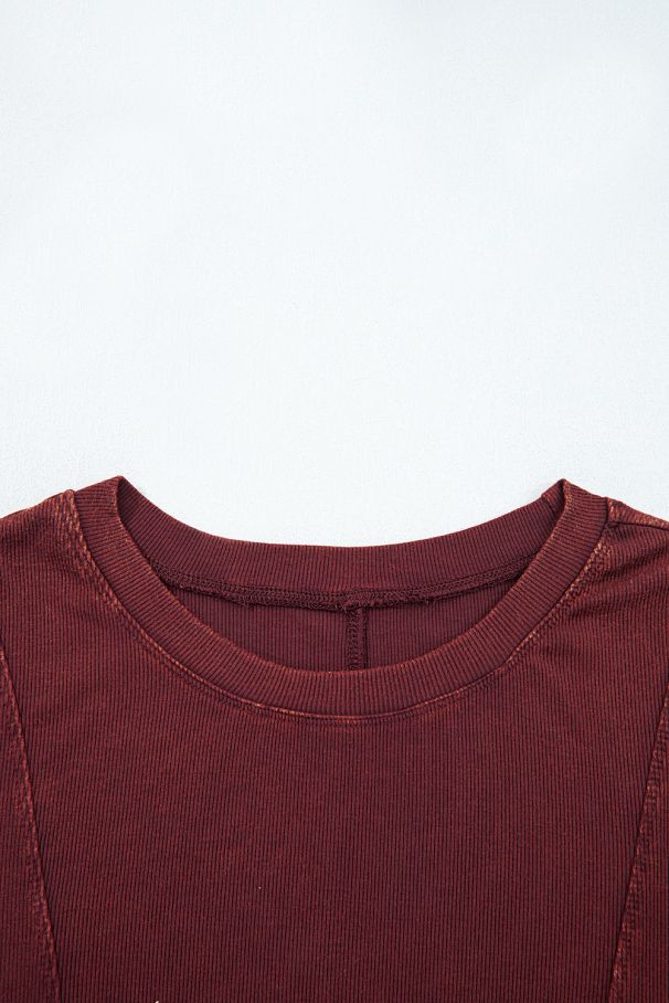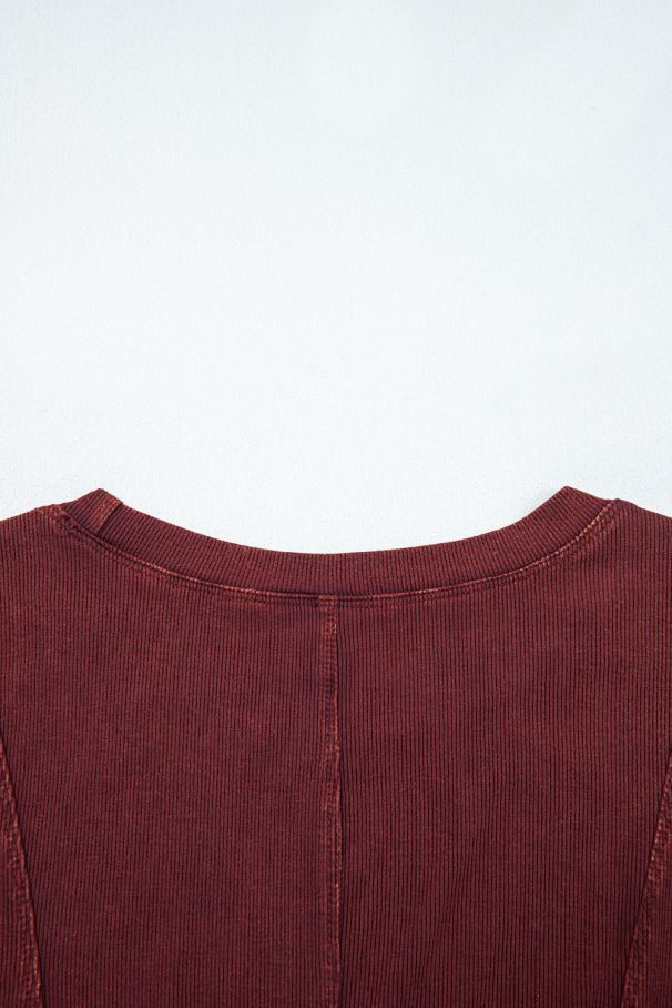 Women's Burgundy Ribbed Top with Decorative Seams and Cuff Buttons