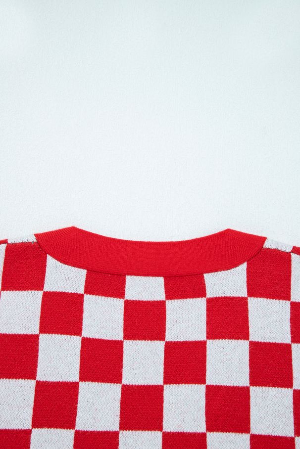 - A festive women’s Christmas cardigan featuring a red and white checkered design decorated with green Christmas trees.
