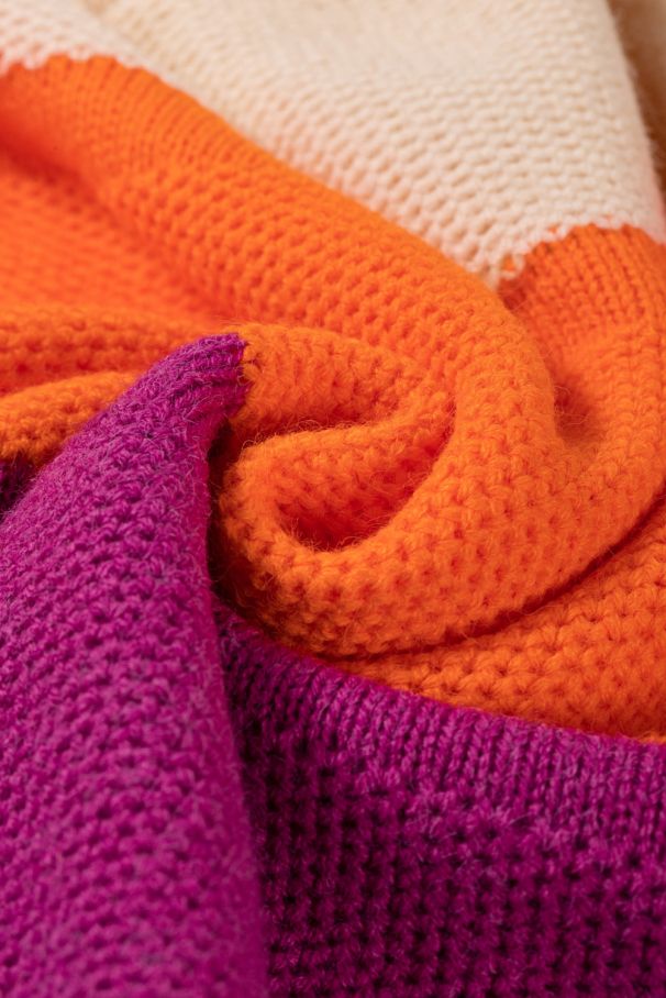- Стилен и модерен дамски плетен пуловер в ярка комбинация от екрю, оранжево и виолетово.