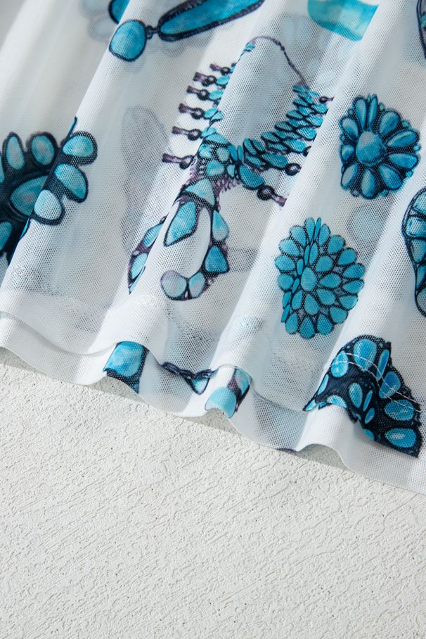 - Лека дамска тениска в бял цвят с ефектни тюркоазени принтове с уестърн мотив.