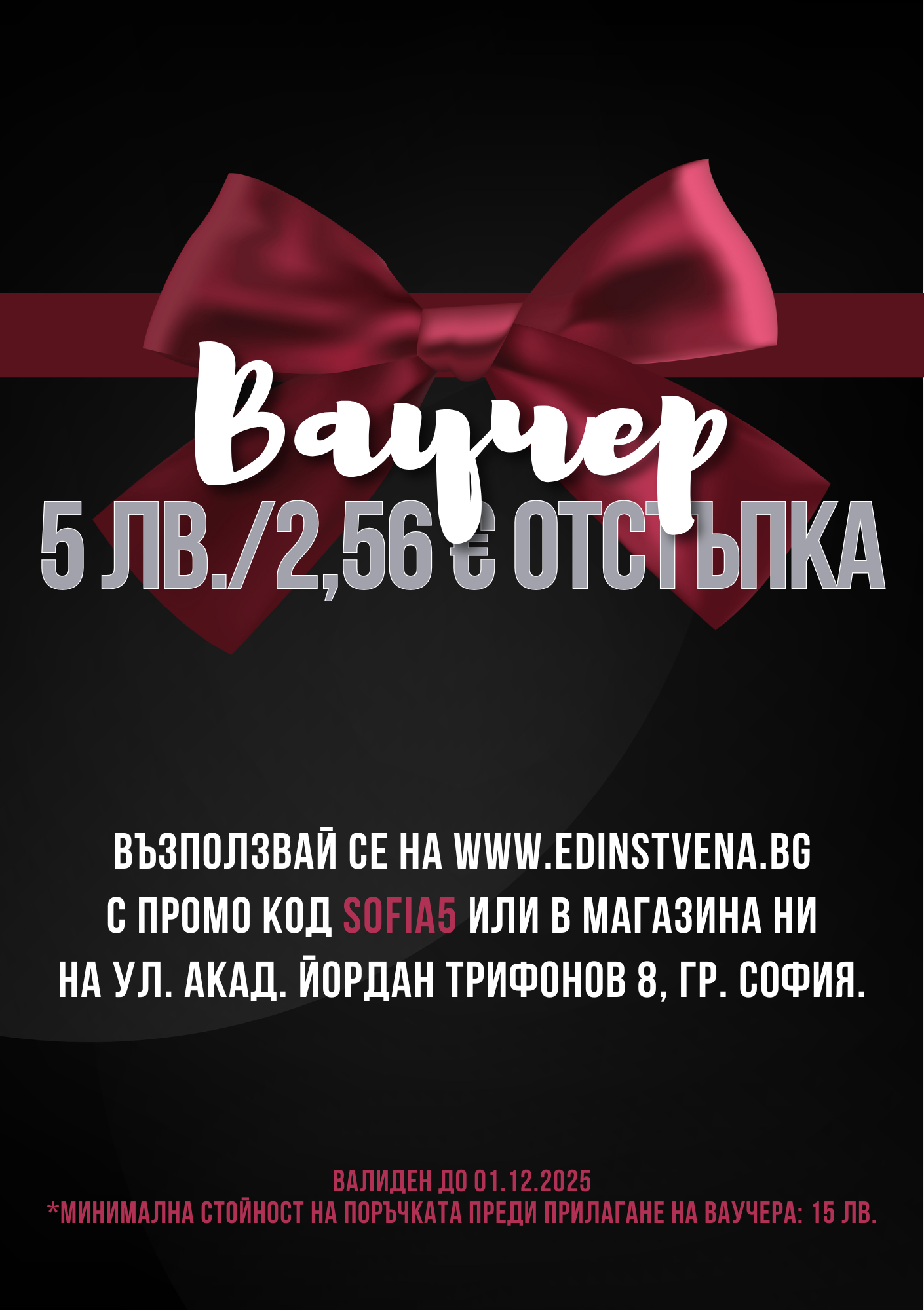 От 15.10.2025 до 01.12.2025 за всяка първа покупка в магазина на стойност над 15 лв./7,67€ можете да се възползвате от 5 лв./2,56€ отстъпка. Промоцията може да бъде получена и на сайта с промо код SOFIA5 преди завършване на поръчка.