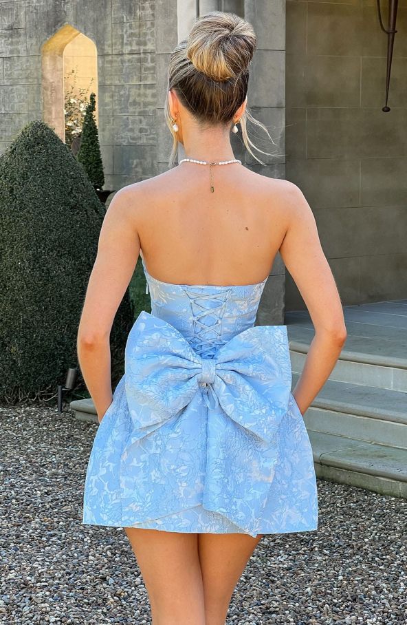 Дамска синя мини рокля без презрамки с флорален релеф и голяма панделка на гърба