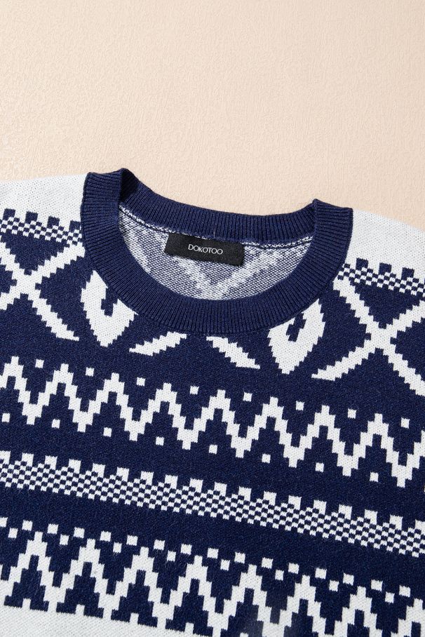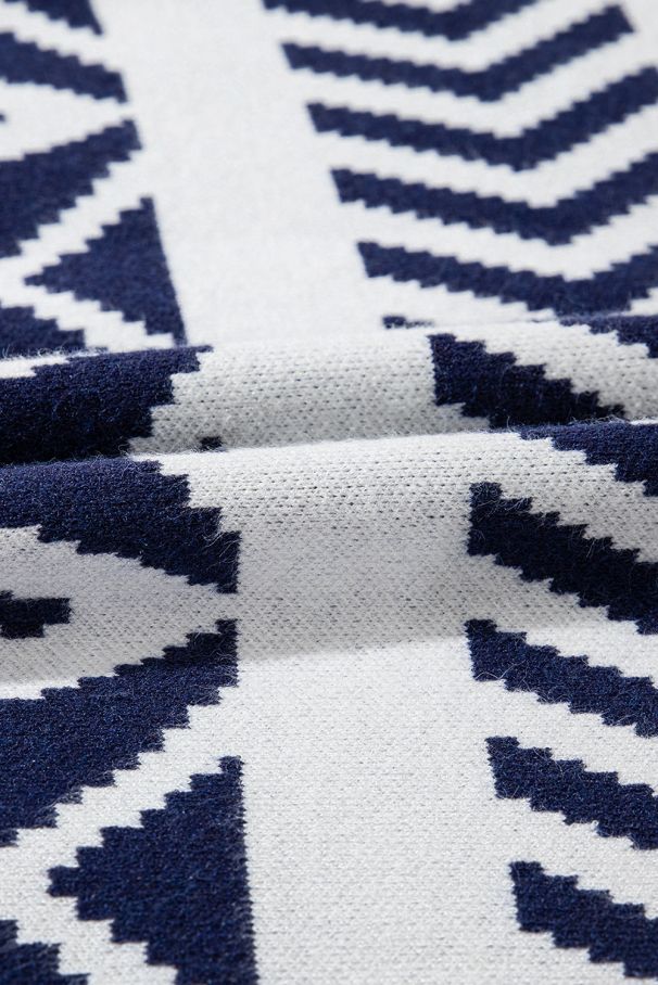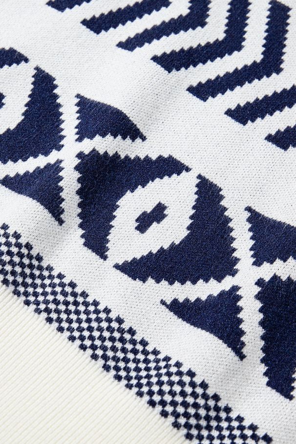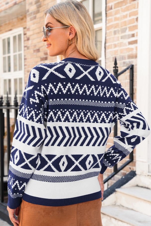 - Този дамски пуловер с абстрактен принт в комбинация от тъмносиньо и бяло съчетава удобство и модерен вид.