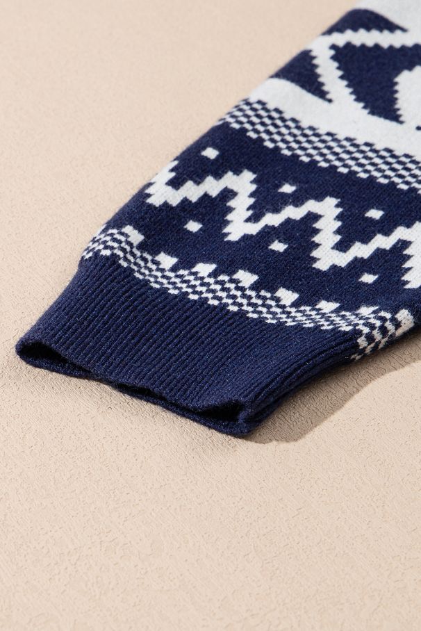Дамски пуловер с абстрактен принт в тъмносиньо и бяло