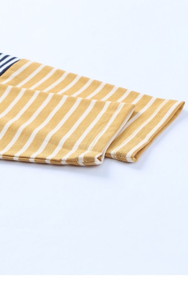 - Стилна дамска блуза с модерни хоризонтални райета, акцентирана с контрастни ръкави в горчичен нюанс.