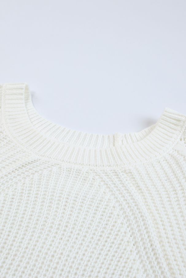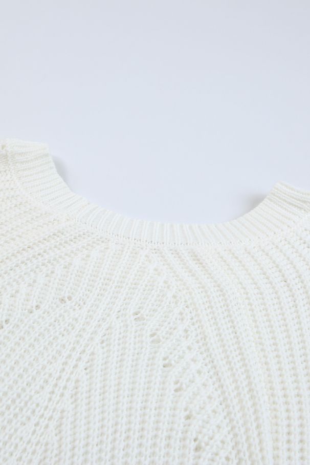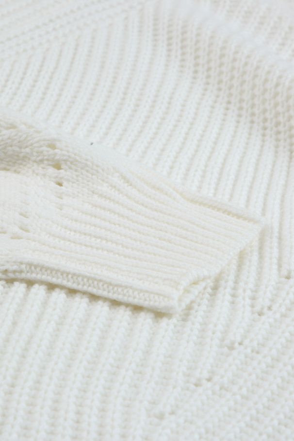 - Бял пуловер с изискана ажурна плетка и мека текстура, която осигурява комфорт и стил през целия ден.