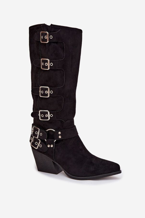 Дамски черни каубойски ботуши от еко велур с катарами
