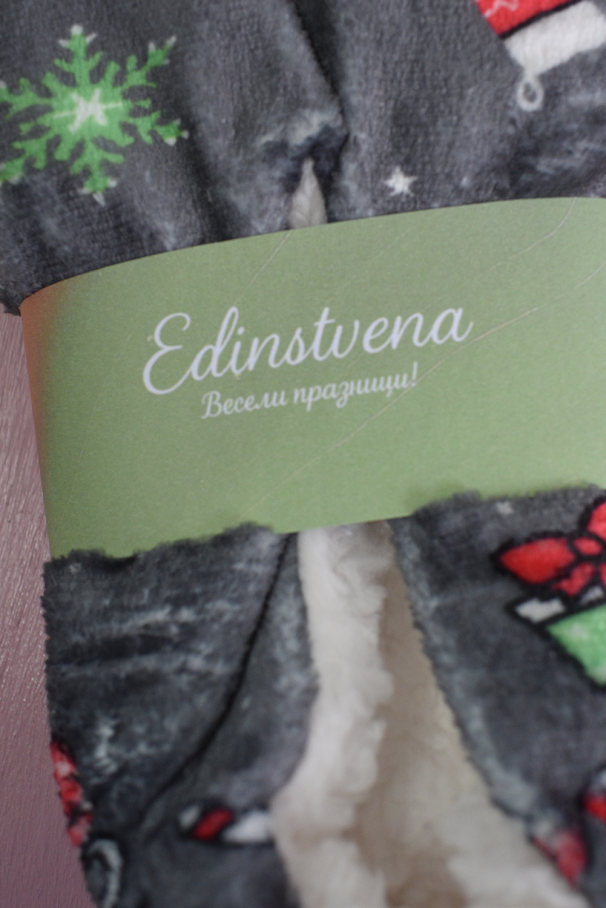 • Топли и меки сиви пантофи с коледни мотиви - снежинки, подаръци, ръкавички и празнични детайли.