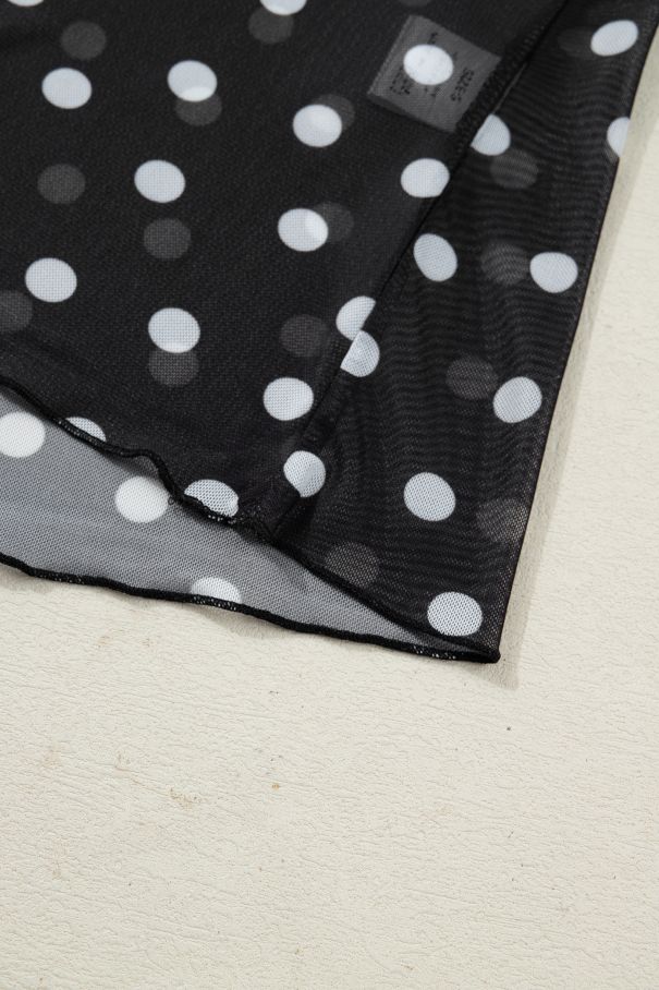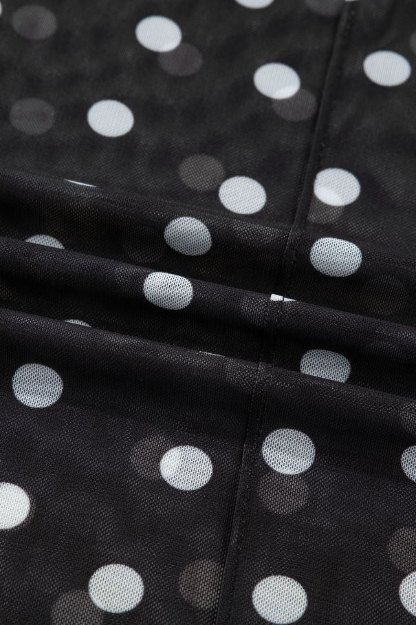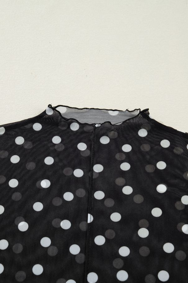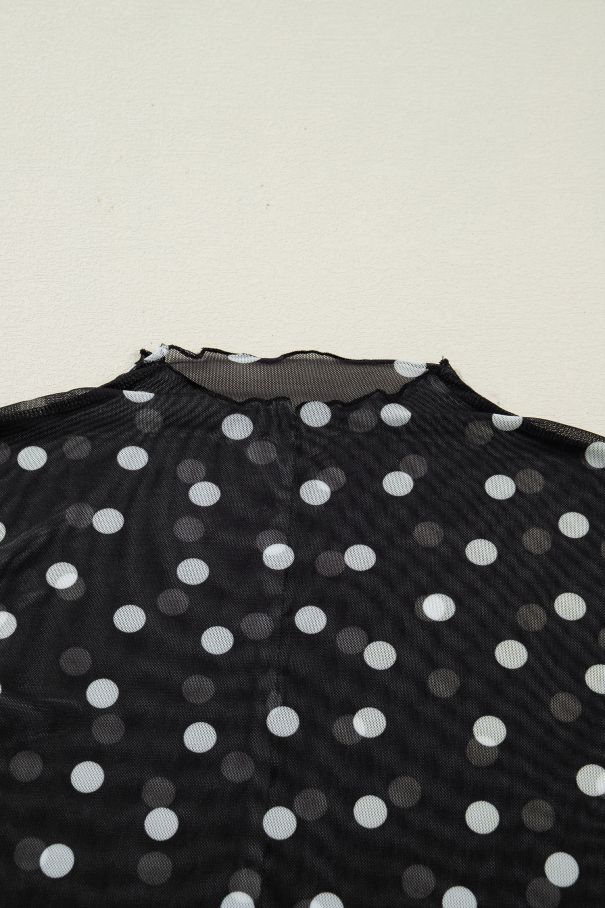 - Black mesh top with white polka dots, a mock neck, and long sleeves.